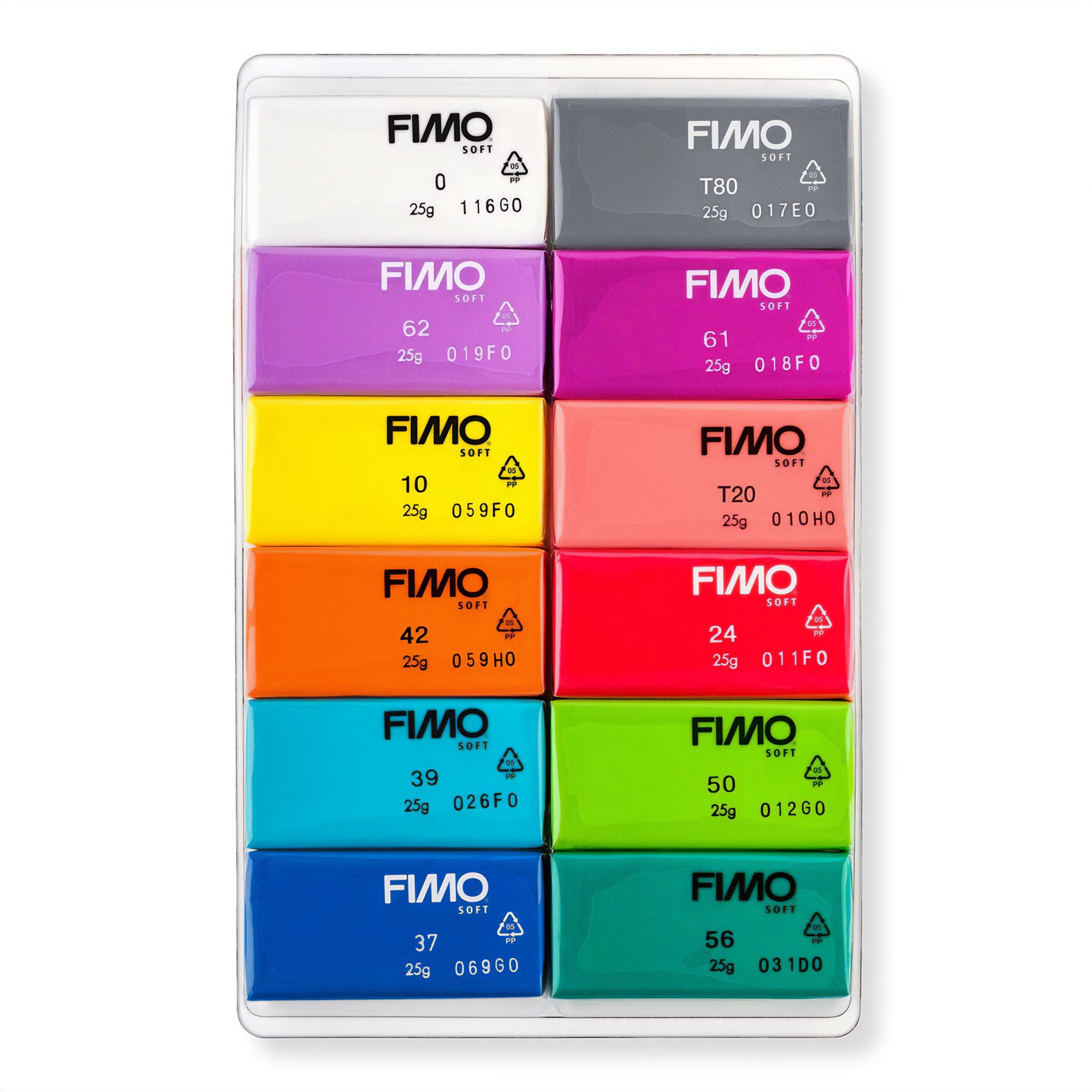 FIMO Soft Material Pack with 12 Half Blocks - BrilliantThis Staedtler FIMO soft material pack contains 12 half blocks of 25g soft and smooth, oven-hardening clay. The Brilliant colours contain pure pigment for a true, vibrant aesthetic. The clay holds fine detailing well. Great for beginners and hobby artists. Product Information