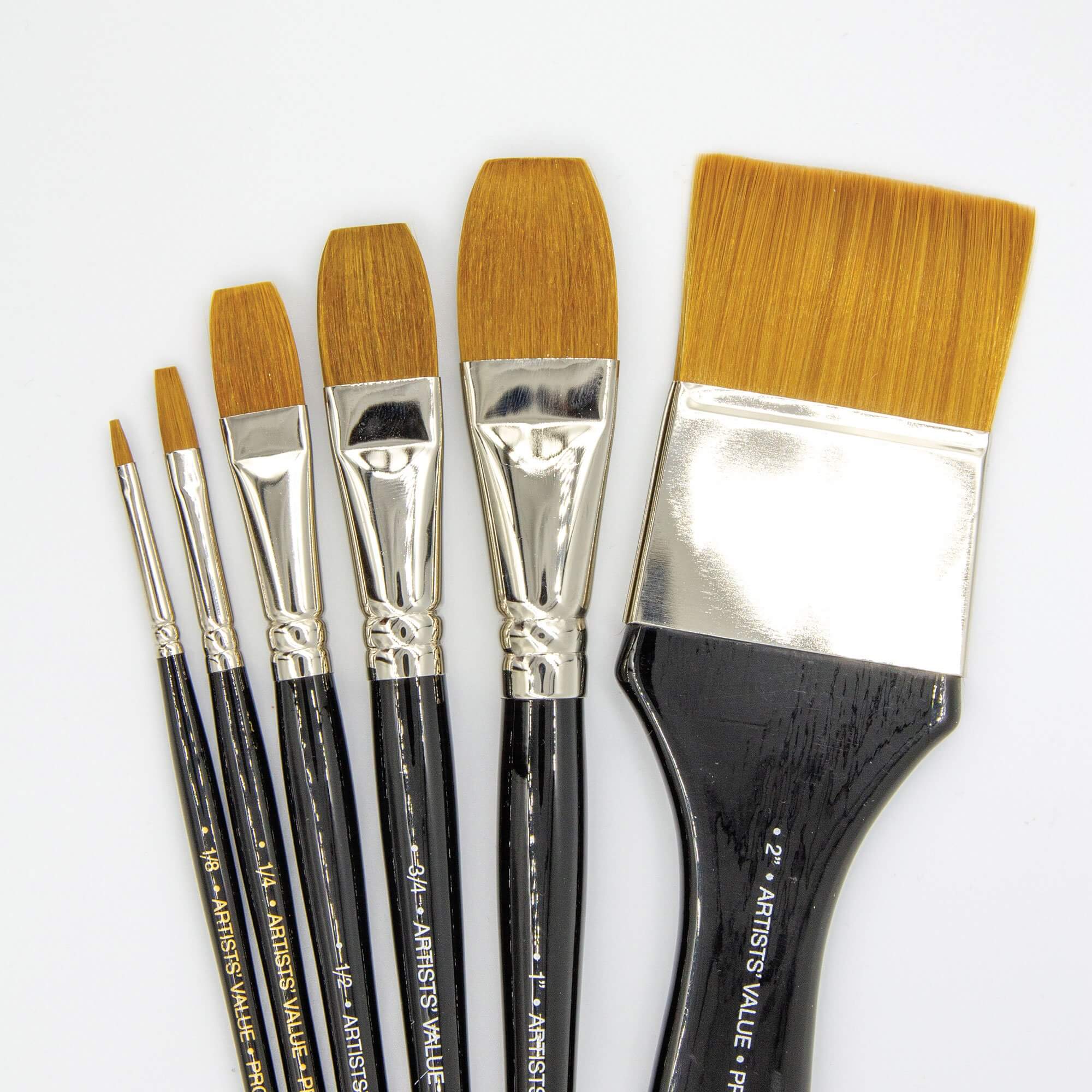 ARTdiscount Artists Value Profile Brushes - FlatArtists Value Profile These are the ultimate synthetic watercolour brushes. Crafted from Taklon, using a blend of differing hair diameters, these brushes give a combination of colour holding, precision and endurance. Ranging from a 1/8" to a size 2", it is the most comprehensive range in the Artist’s Value series. A perfect brush for serious students of art and professionals alike, you will find that Taklon brushes are suitable for varying mediums. |