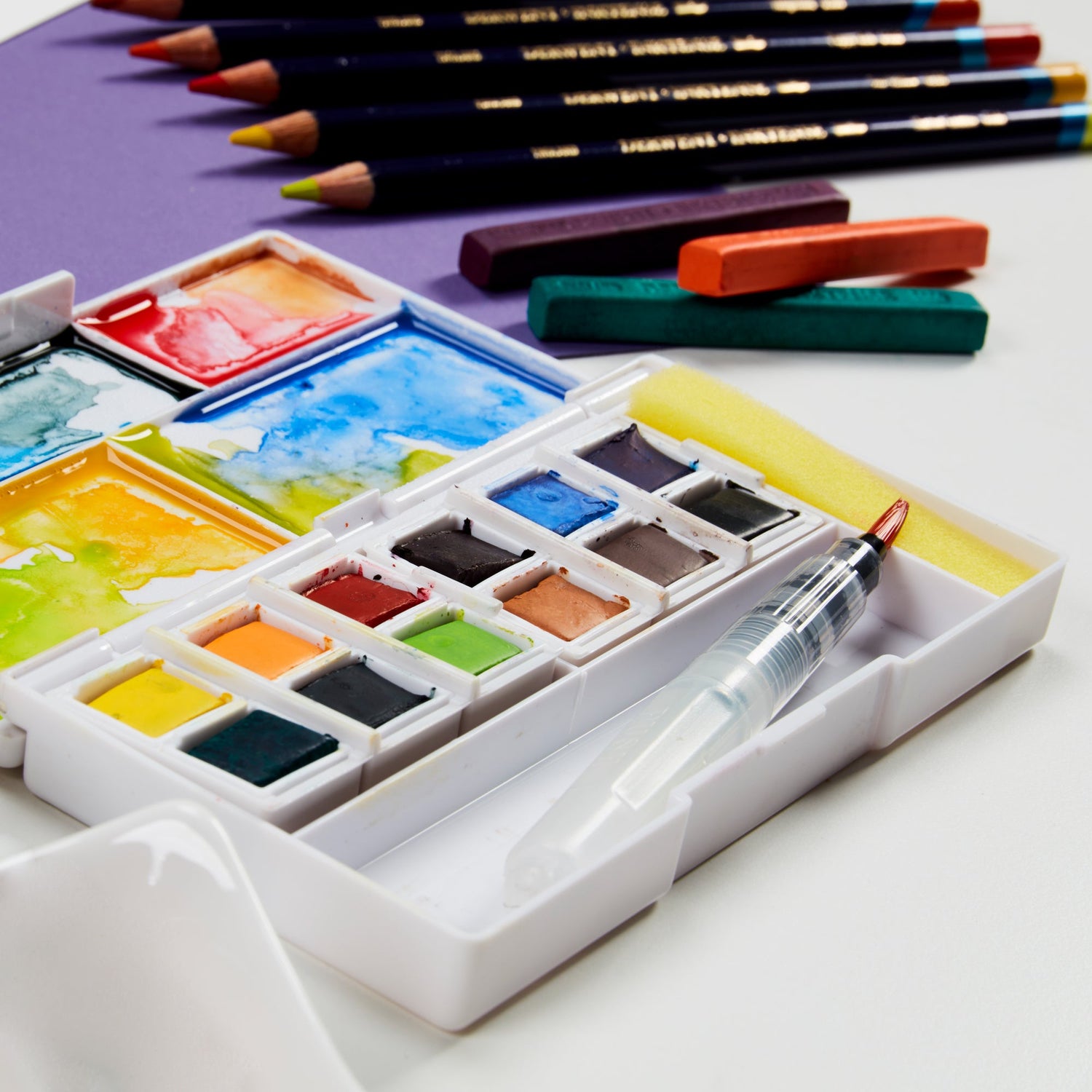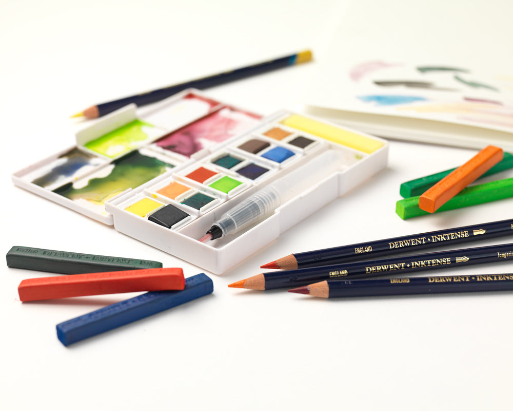 The Derwent Inktense range features a variety of pencils, pastel-like ink blocks, and watercolour paint sets.