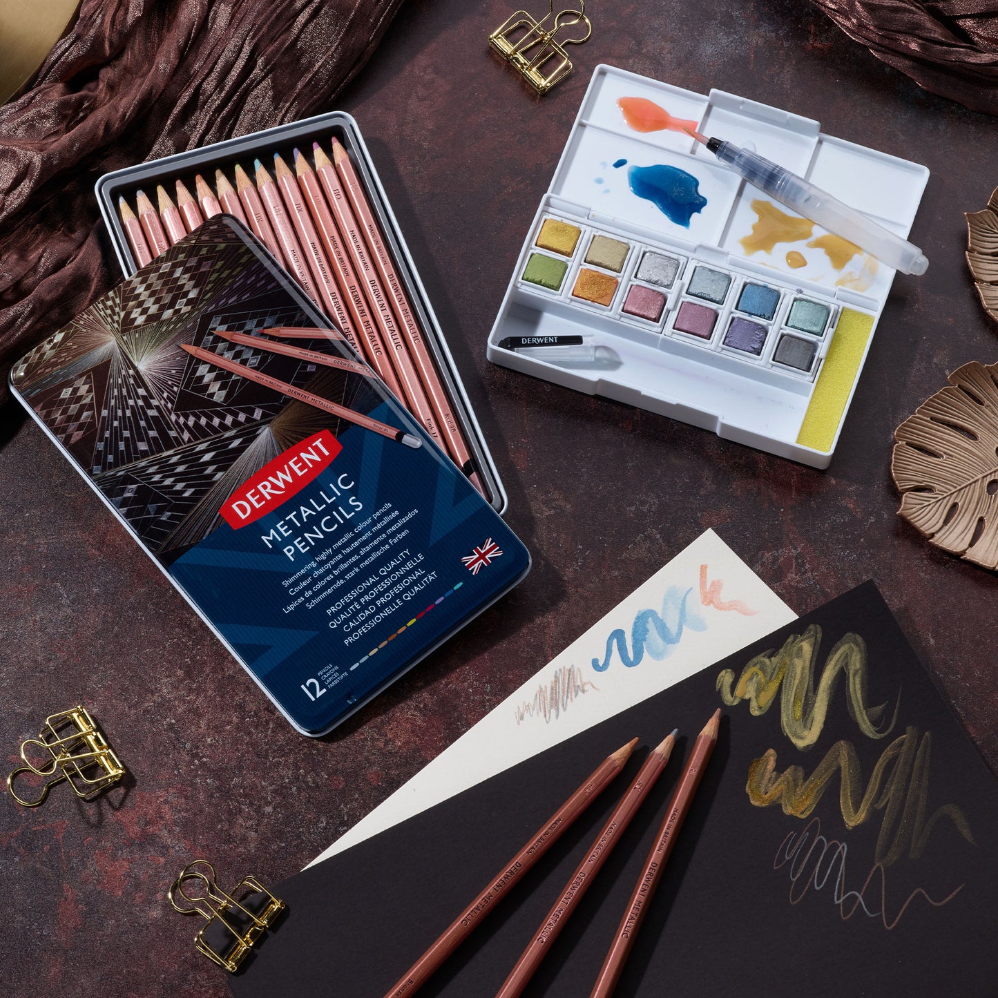 These Derwent Metallic Pencils are highly reflective and blend together beautifully to create vivid and striking effects. The shimmering pigments produce brilliant definition — especially when used on dark backgrounds — and open up an array of possibilities to any creative artist.