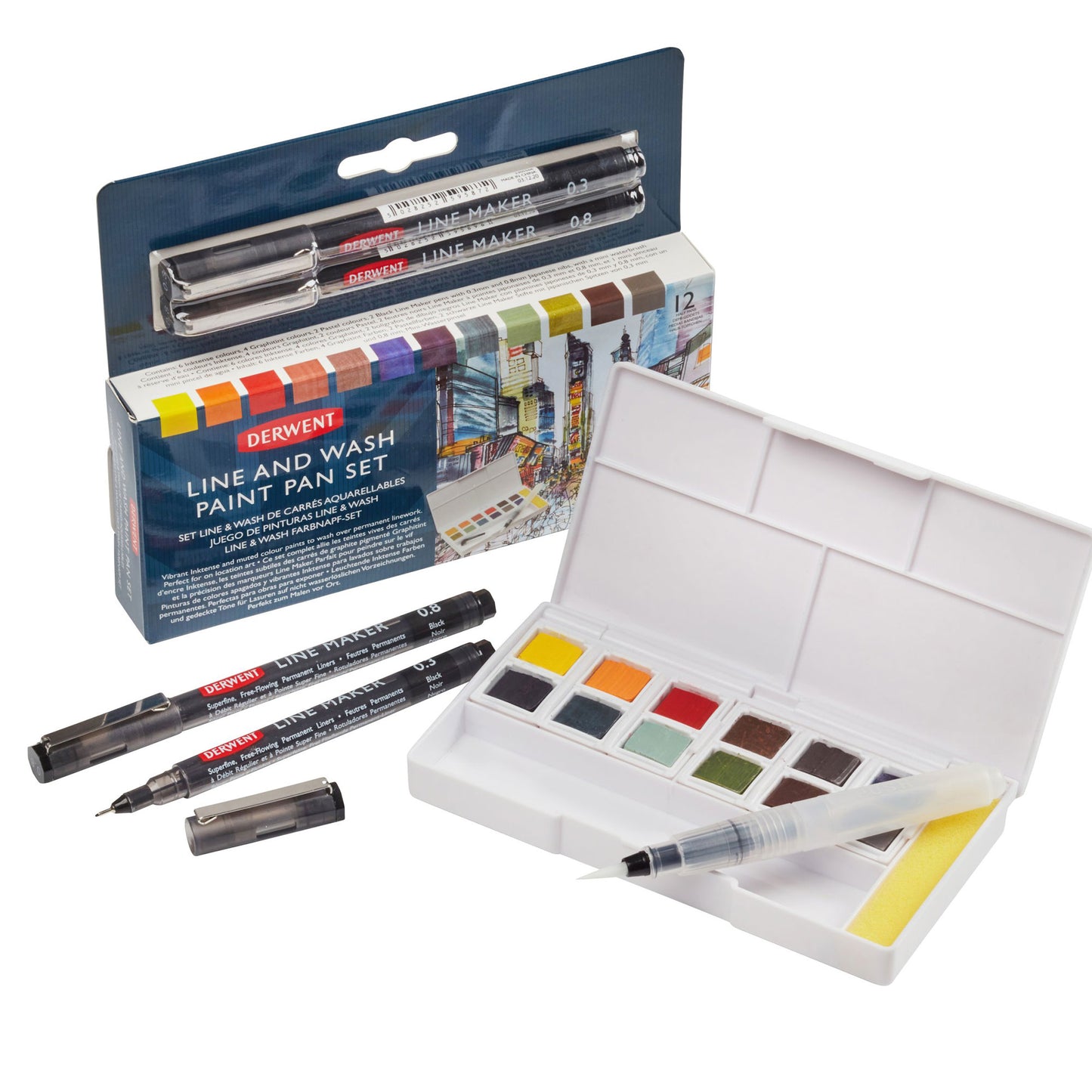 This pocket-sized set contains two Line Makers, 12 paint pans, five mixing palettes and a sponge to clean the water brush and is ideal for urban sketching and on location art. The perfect accomplice for a watercolour sketchbook.