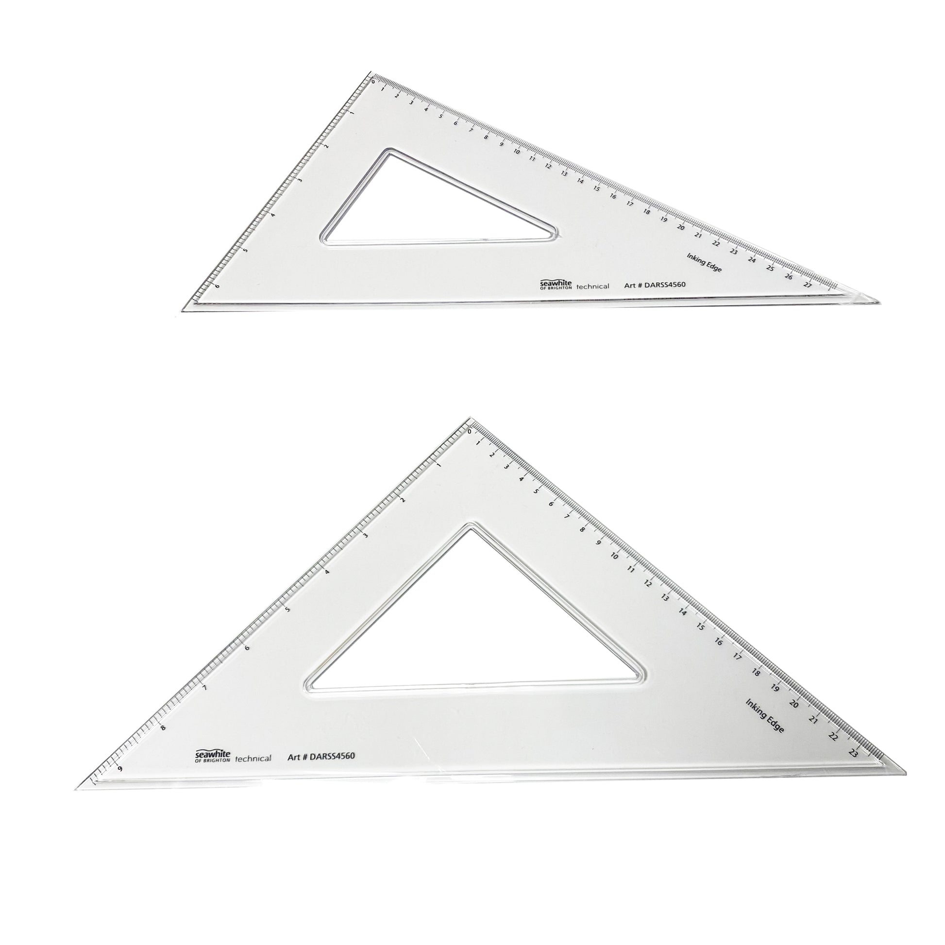 These set squares from Seawhite are made from a clear plastic and are engraved in inches and centimetres. They come in a set of two, and both feature an inking edge.