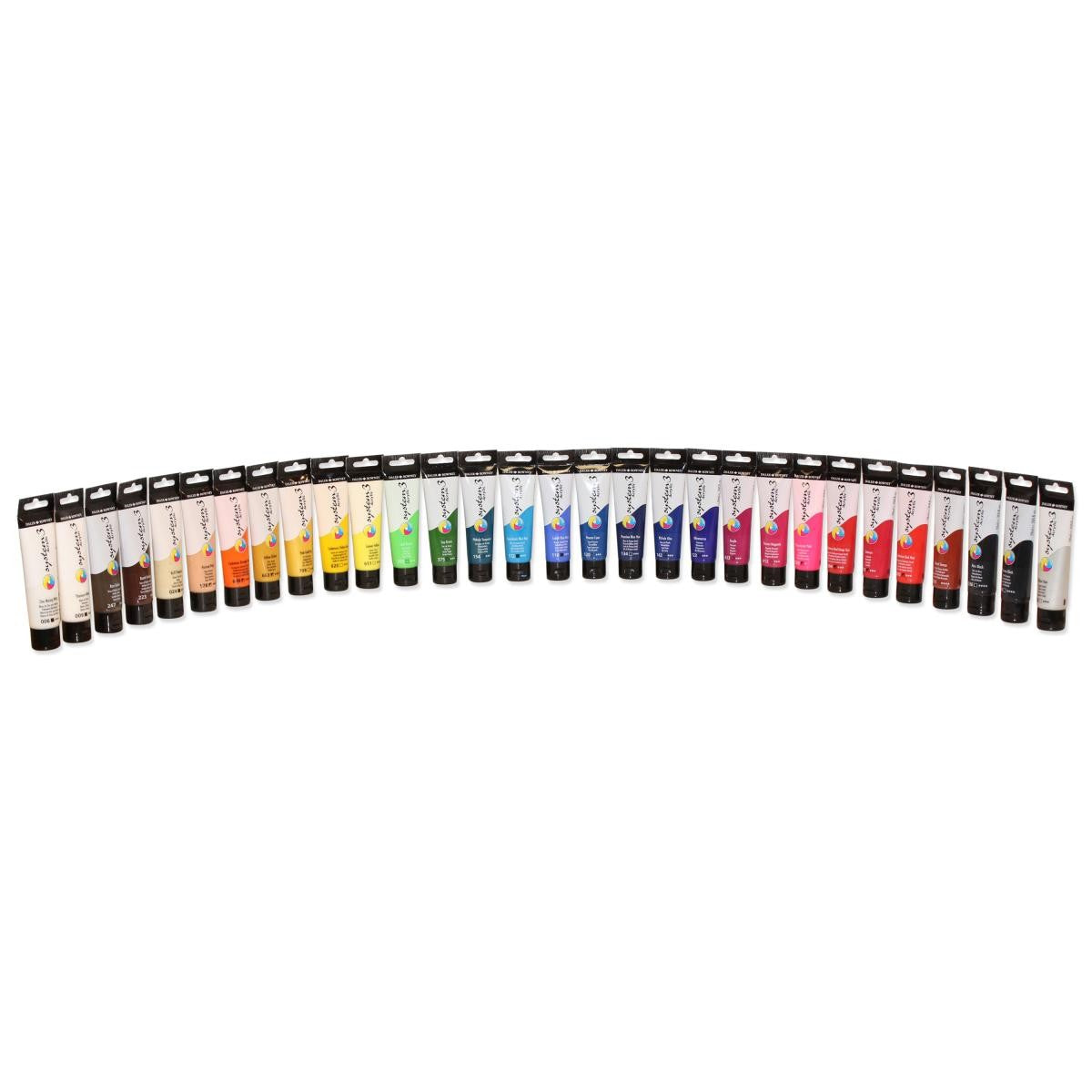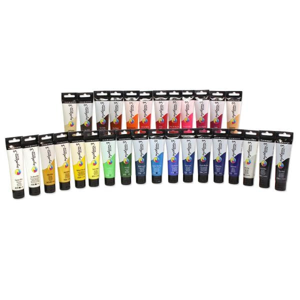 Daler-Rowney System3 Acrylics are versatile water-based colours made from high-quality pigments. System3 Acrylic colours are lightfast, permanent (ranking from 3 to 4 stars for most of the colours), opaque (10 opaque and 20 semi-opaque colours), flexible and quick-drying, making them suitable for applications on paper, cardboard, canvas, metal, wood, brick, and more.